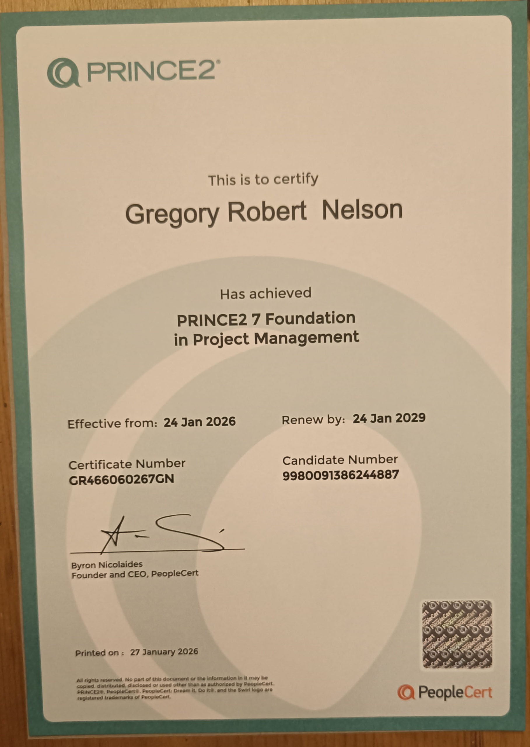 CSCS mangers card which shows the NVQ 7 and 6 I obtained and my registration number this means I am competent to project manage any residential or commercial site.